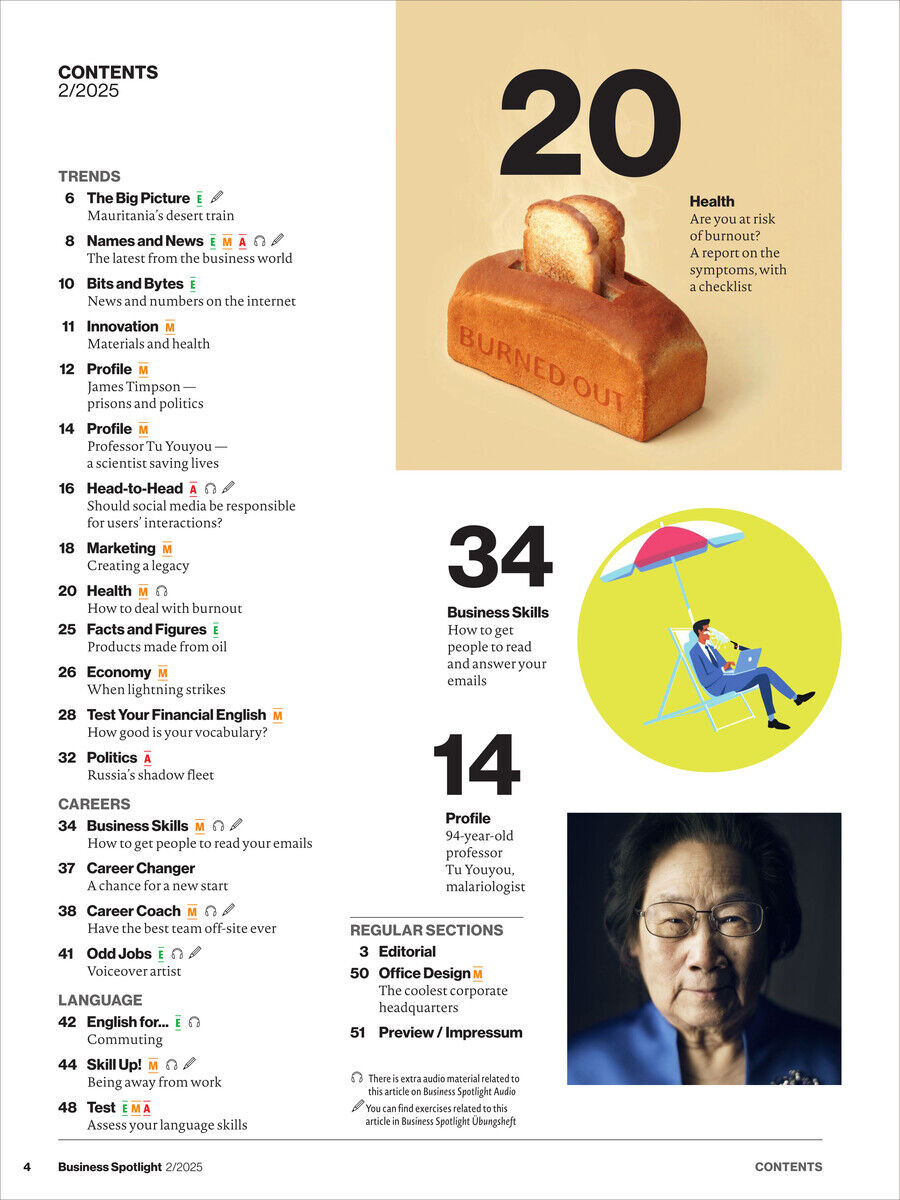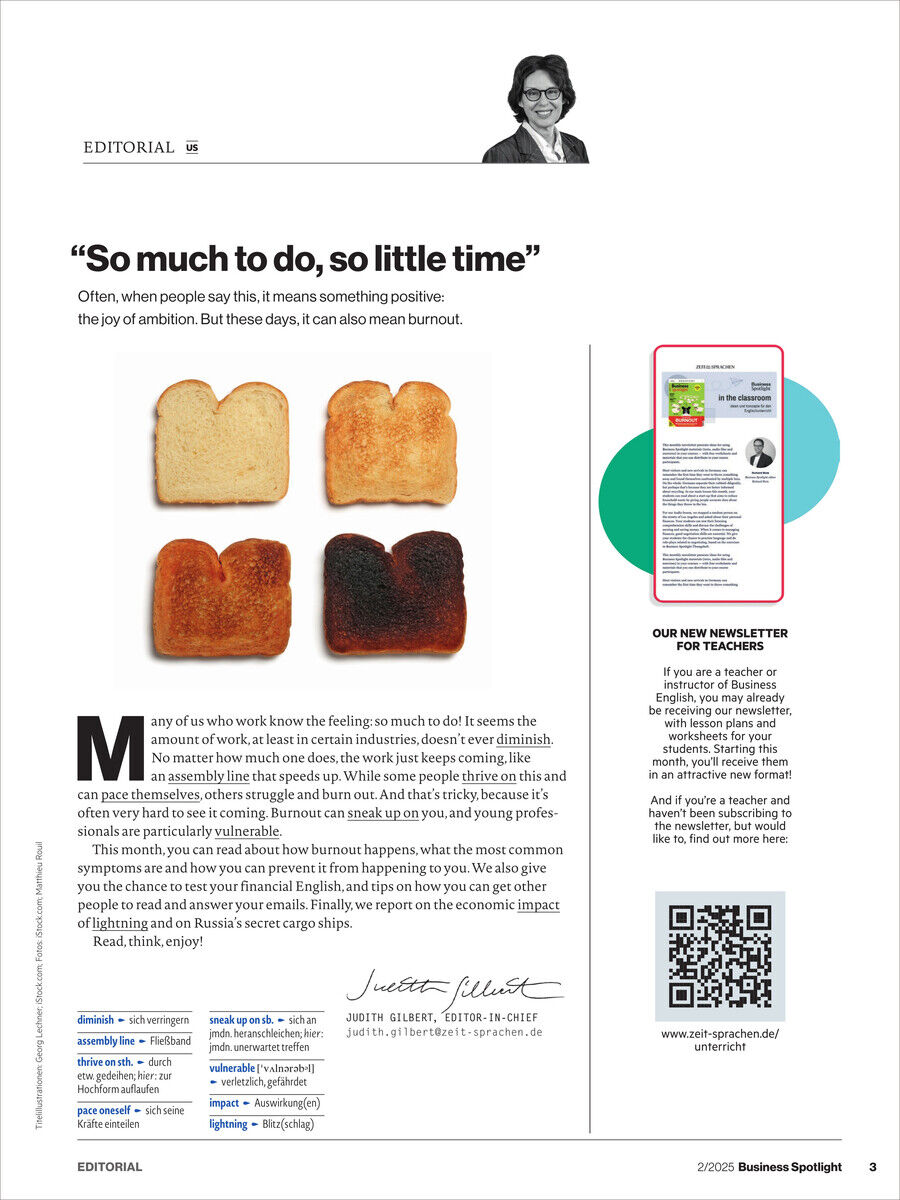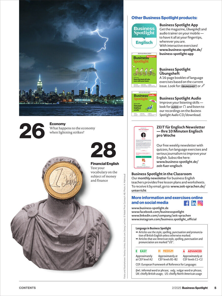 Business Spotlight verbessert nicht nur Ihr sprachliches Niveau in der internationalen Geschäftswelt, sondern gibt Ihnen darüber hinaus auch Tipps und Tricks für interkulturelles Arbeiten sowie aktuelle Berichte zu interessanten Ereignissen der Business-Welt.