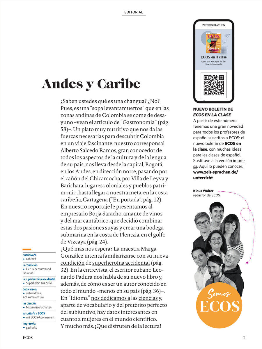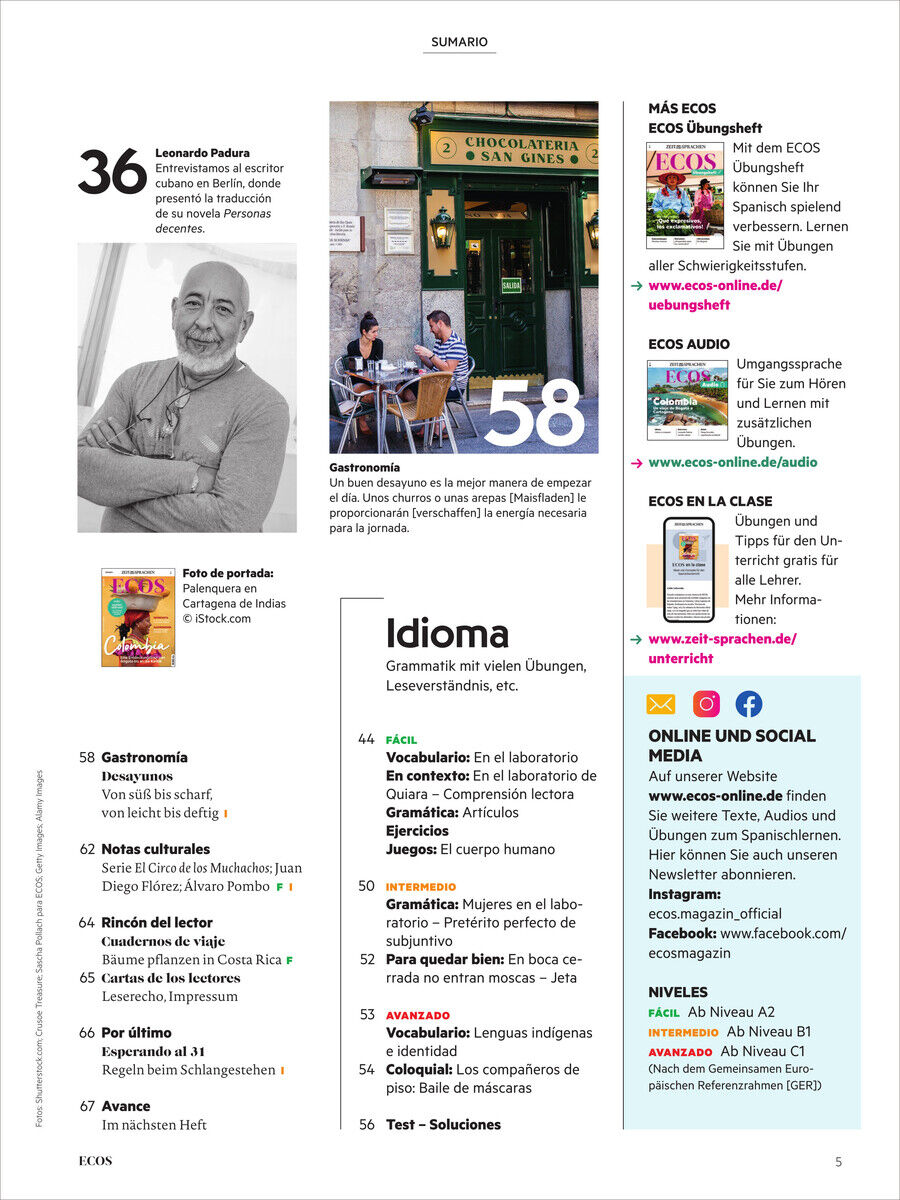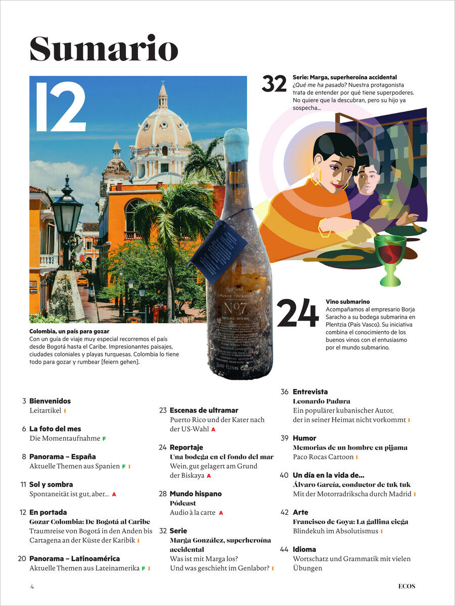 Ob Spanien oder Lateinamerika: Ecos nimmt Sie mit auf eine Reise durch die spanischsprachige Welt und zeigt Ihnen die schönsten Orte, beeindruckende Kulturen und kulinarische Besonderheiten. Ganz nebenbei verbessern Sie zudem umfassend Ihr sprachliches Know-How durch Wortschatz-, Grammatik- und Vokabelübungen.