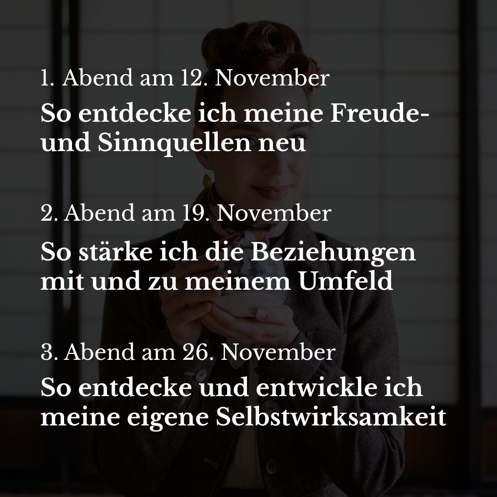In dieser interaktiven Reihe erkunden Sie Ikigai auf drei Ebenen: mit sich selbst im ganz normalen Alltag, mit Ihrem sozialen Umfeld und mit der Welt. Sie nehmen konkrete Impulse und Übungen mit, die Ihre innere Ruhe, Zufriedenheit, Zuversicht und Resilienz stärken – auch in Krisenzeiten.