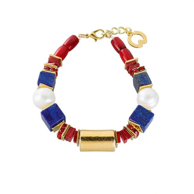Das handgefertigte Set, bestehend aus Collier, Armband und Ohrhängern zitiert die vielleicht bekannteste Liebesgeschichte der Welt – Shakespeares Romeo & Julia. Rote Korallen treffen auf golddurchzogenen Lapislazuli sowie vergoldetes Messing und werden stilvoll von echten Zuchtperlen ergänzt.