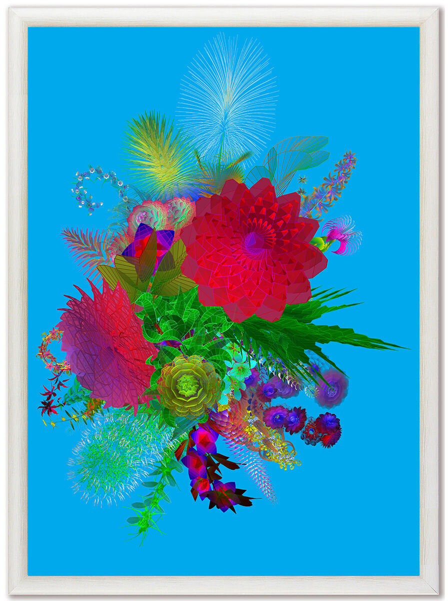 Das Kunstwerk besticht durch seine fluoreszierenden Farben, die einen lebendigen, algorithmischen Blumenstrauß kreieren. Diese leuchtenden Farben spiegeln auf poetische Weise die moderne Beziehung zwischen Natur und Künstlichkeit wider – eine harmonische Coexistenz, die beide Bereiche bereichert.