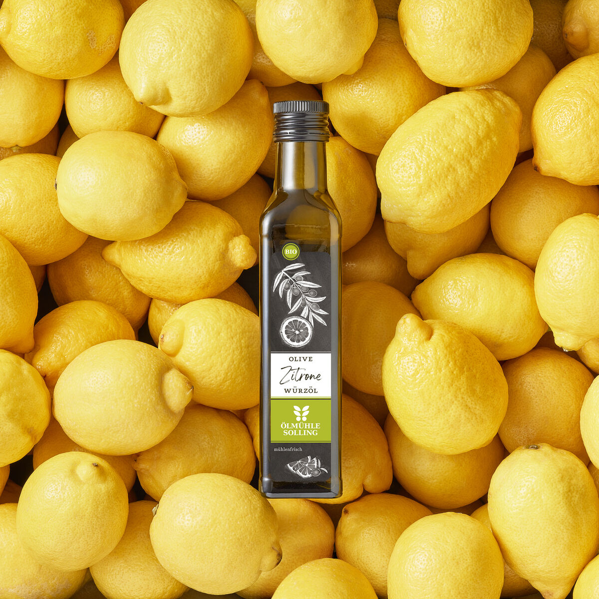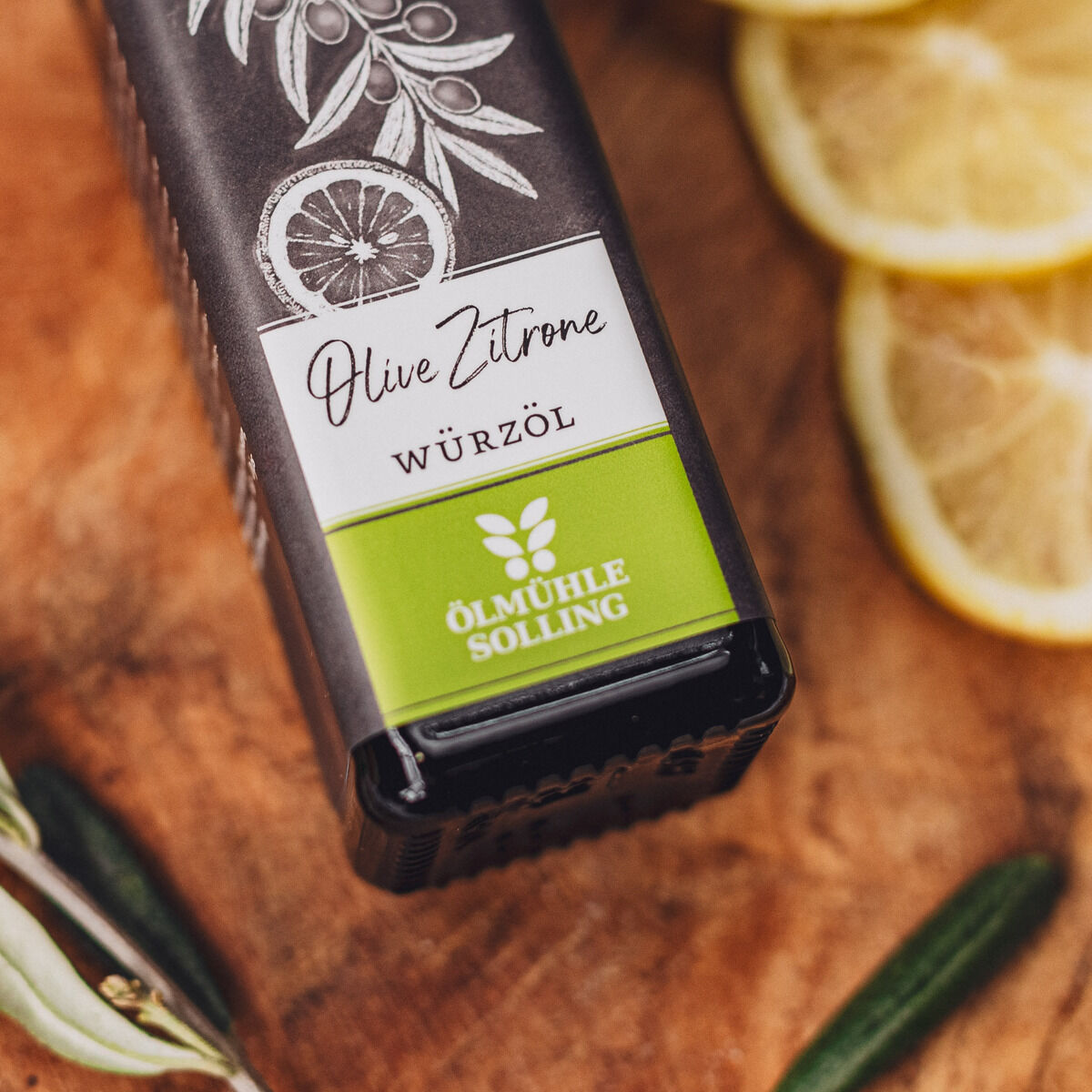 Drei Flaschen mediterranes Bio-Würzöl à 250 ml stehen nebeneinander. Jede Flasche hat ein schwarz-grünes Etikett mit weißer Schrift und einer Illustration von Oliven und einer Zitrone. Die Flaschen bestehen aus dunklem Glas und besitzen schwarze Schraubverschlüsse. Das Produkt ist als Geschenkset für mediterrane Feinschmecker und Kochbegeisterte geeignet.