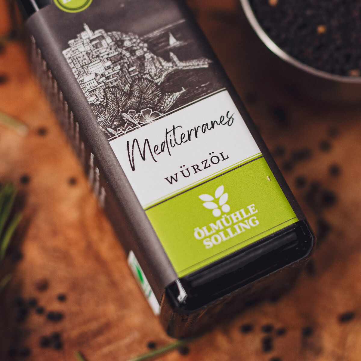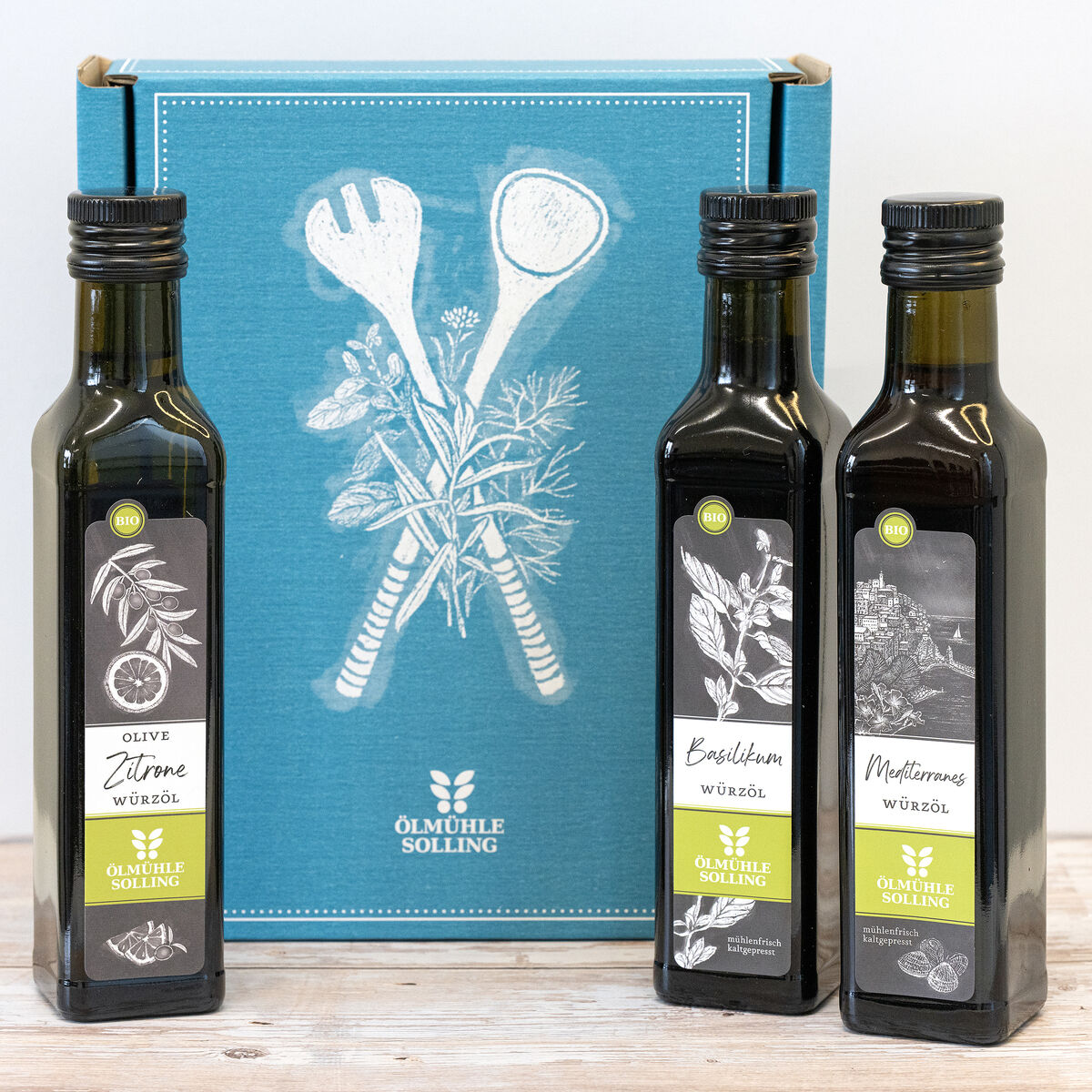 Drei braune Glasflaschen mediterranes Bio-Würzöl der Marke Ölmühle Solling mit grün-weißem Etikett und skizziertem Küstenmotiv, aufgereiht nebeneinander vor weißem Hintergrund. Die Flaschen sind 250 ml groß und dienen als Geschenk- oder Feinkostset.